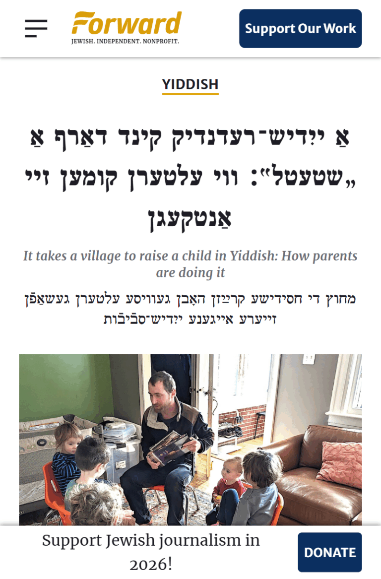 When reporting the article “It takes a village to raise a child in Yiddish: How parents are doing it,” published in Yiddish in the Forverts (18 December 2025), I came across a wealth of stories, resources, and information about a topic that clearly deserves more public discussion in the Yiddish world: how parents can come together to share Yiddish language and culture with their children. These collaborations are beneficial even for families that mostly speak other languages at home. My article centered on the very rare cases of Yiddish-speaking families outside Hassidic Communities, but this supplement extends beyond them.
